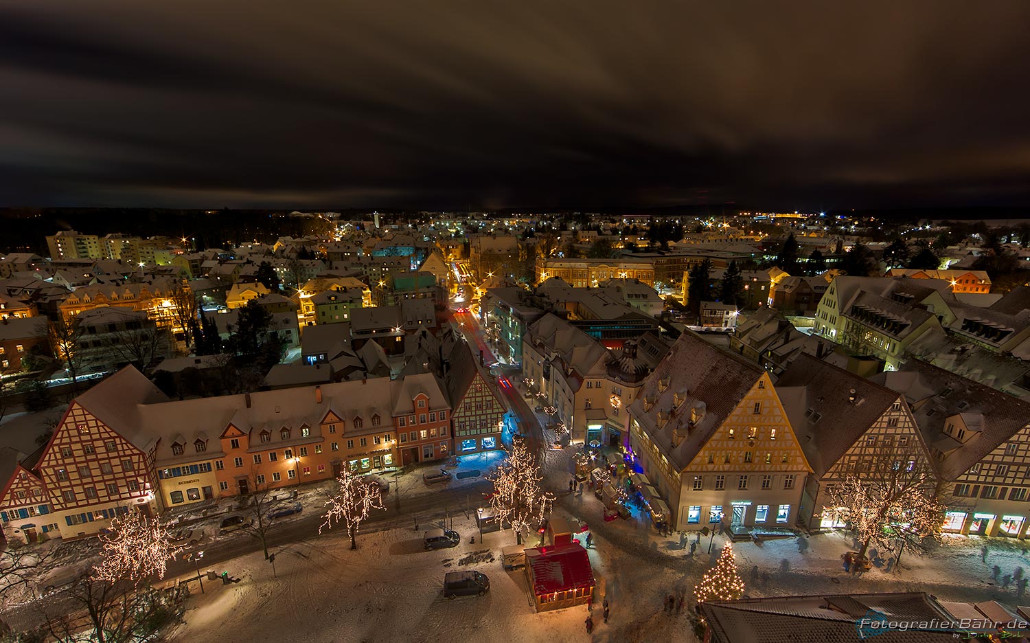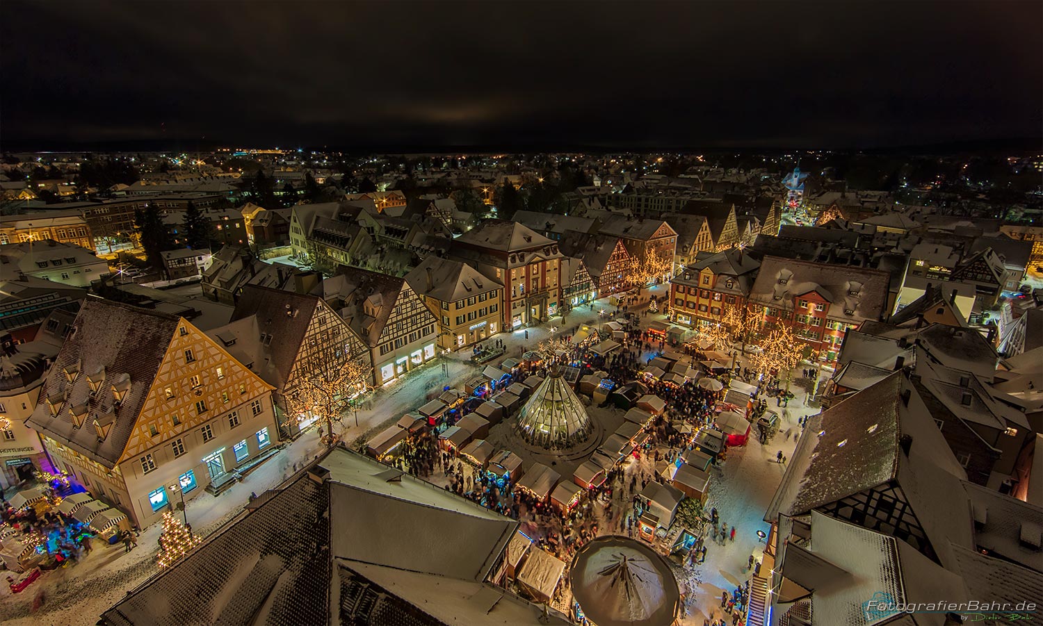 Bilder vom Schwabacher Weihnachtsmarkt von oben, der Bilck vom Kirchturm der Stadtkirche Stadtkirche St. Johannes und St. Martin in Richtung Nürnberg und ein Bilder der Stadtkirche von innen.
